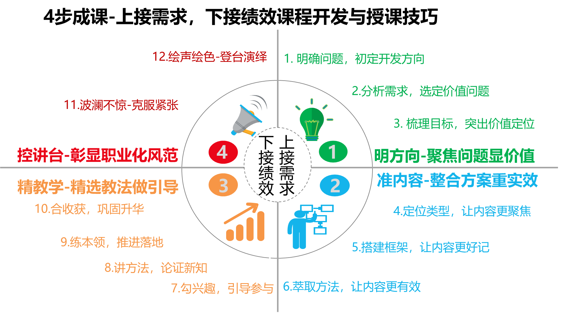 標(biāo)準(zhǔn)運(yùn)用:標(biāo)準(zhǔn)語(yǔ)言、肢體語(yǔ)言、控場(chǎng)技巧進(jìn)行授課,彰顯職業(yè)化風(fēng)范與感染力;